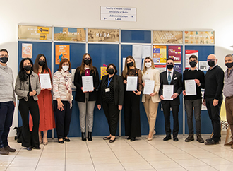 Immersed within an atmosphere of strict seated social distancing rules and mask wearing, Dean Roberta Sammut presented awards to nine undergraduate students for their academic achievements: Francesca Sammut, Jonathan Grech, (In absencia) Martina Grech, (in absencia), Gareth Portelli, Lynn Scicluna, Corlis Briffa, Robert Pisani, Nicola Hili and Erica Bonello.
