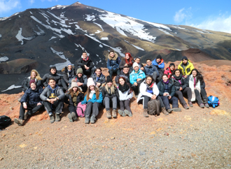 On the first day, the group of students accompanied by three academic staff members from the Institute travelled by cable car and snowmobile to the summit of Mount Etna at around 3,000 metres above sea level, where they were able to view both historic lava flows and the active Southeast craters. This summit excursion included a briefing on Europe’s largest and most active volcano, and was followed by a visit to the inactive craters at Monti Silvestri at the lower altitude of 1,900 metres.