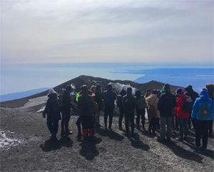 On the first day, the group of students, accompanied by four staff members from the Institute, travelled by cable car and all-wheel drive Unimog vehicles to the summit of Mount Etna at around 3,000 metres above sea level, where they were able to view both historic lava flows and the active Southeast craters. This summit excursion included a briefing on Europe’s largest and most active volcano, and was followed by a visit to the inactive Monti Silvestri craters at an altitude of 1,900 metres.